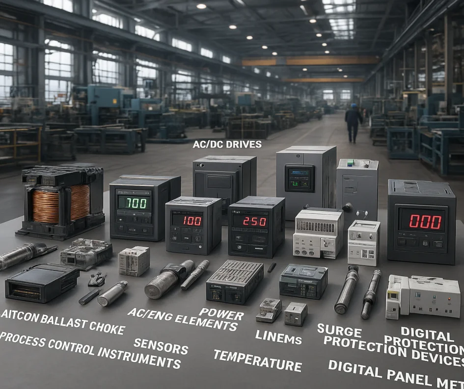 Sigmatech supplies a wide portfolio of industrial components including AC drives, servo motors, PLCs, HMIs, sensors, proximity switches, encoders, relays, thermocouples, power supplies, SMPS, RFID systems, barcode scanners, transformers, cables, and low-voltage switchgear products from reputed brands like Siemens, Delta, and Pepperl+Fuchs.